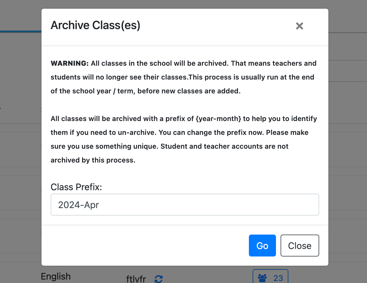 6. Click '**Go**' when you are ready to archive. Your classes will be archived and available in the **Archived Classes** tab.&#x20;